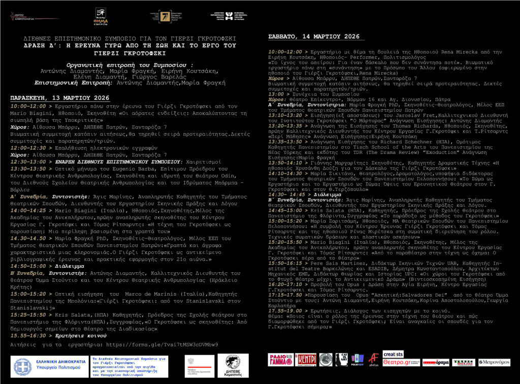 «Συναντώντας τον Γιέρζυ Γκροτόφσκι και το έργο του»: ΔΡΑΣΗ Δ’: «Η έρευνα γύρω από τη ζωή και το έργο του Γιέρζι Γκροτόφσκι», 13-14 Μαρτίου 2026 Η τέταρτη δράση του διεθνούς συμποσίου «Συναντώντας τον Γιέρζυ Γκροτόφσκι και το έργο του». Πρόγραμμα, Συμπόσιο Γκροτόφσκι, 13-14 ΜαρτίουΛήψη